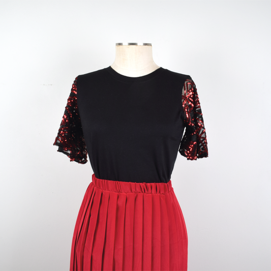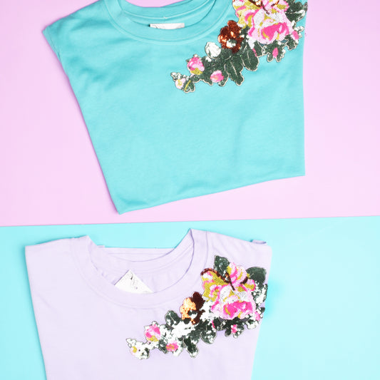 Flores y Hojas Lentejuelas Hombro T-shirt